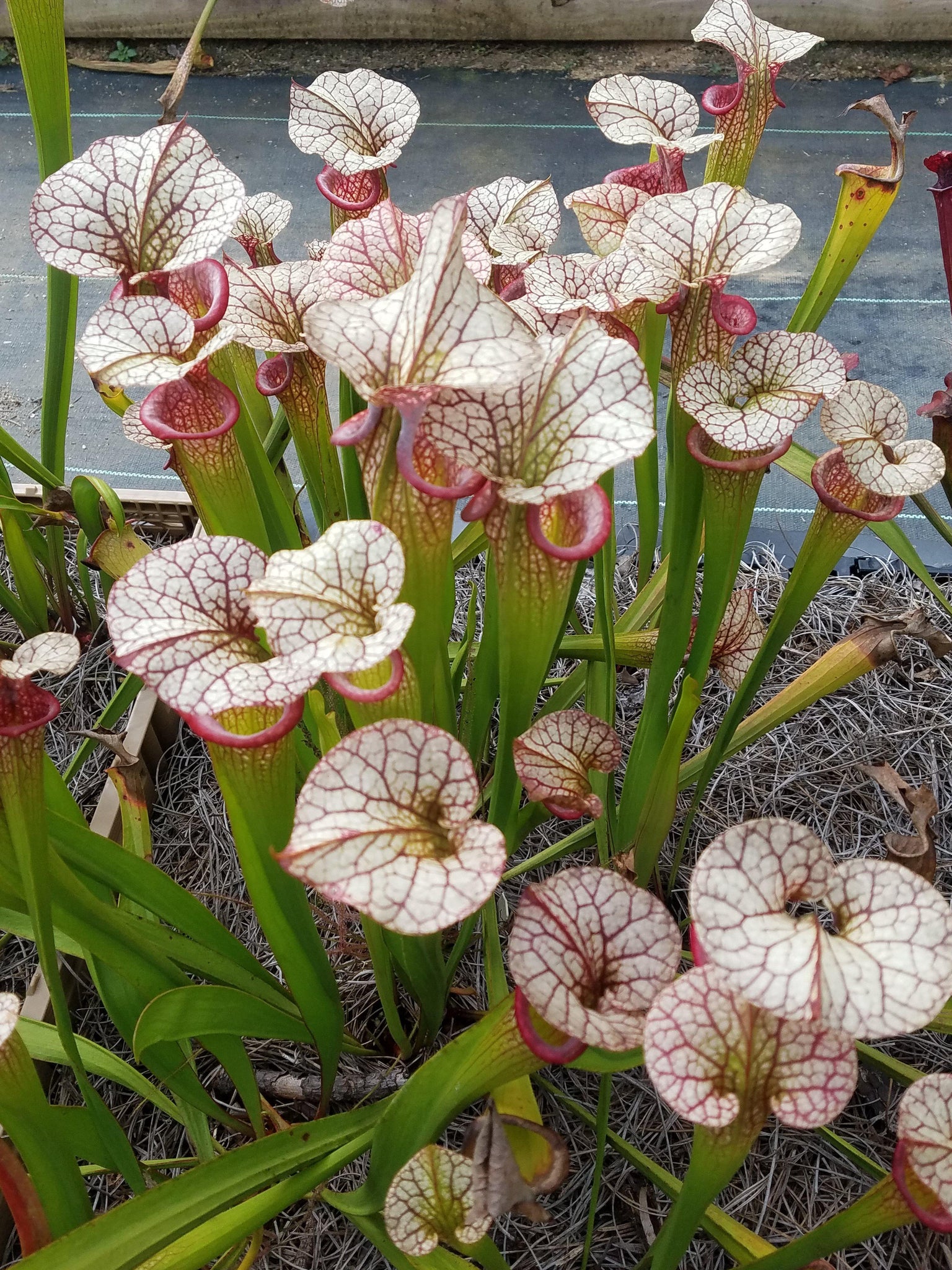 Sarracenia ‘Adrian Slack’ produces its largest pitchers in the spring, measuring 2 feet tall with a 2.5 wide mouth. Fall leaves are slightly smaller and equally as beautiful. This plant is incredible in all aspects and has given rise to many sought-after hybrids. S. ‘Legacy’, S. 'Caitrin Claire' and S. ‘Inspiration’ a few examples of spectacular cultivars using S. ‘Adrian Slack’ as a parent. Whether as a wonderful garden plant or as a breeder, S. ‘Adrian Slack’ is in a league of its own.