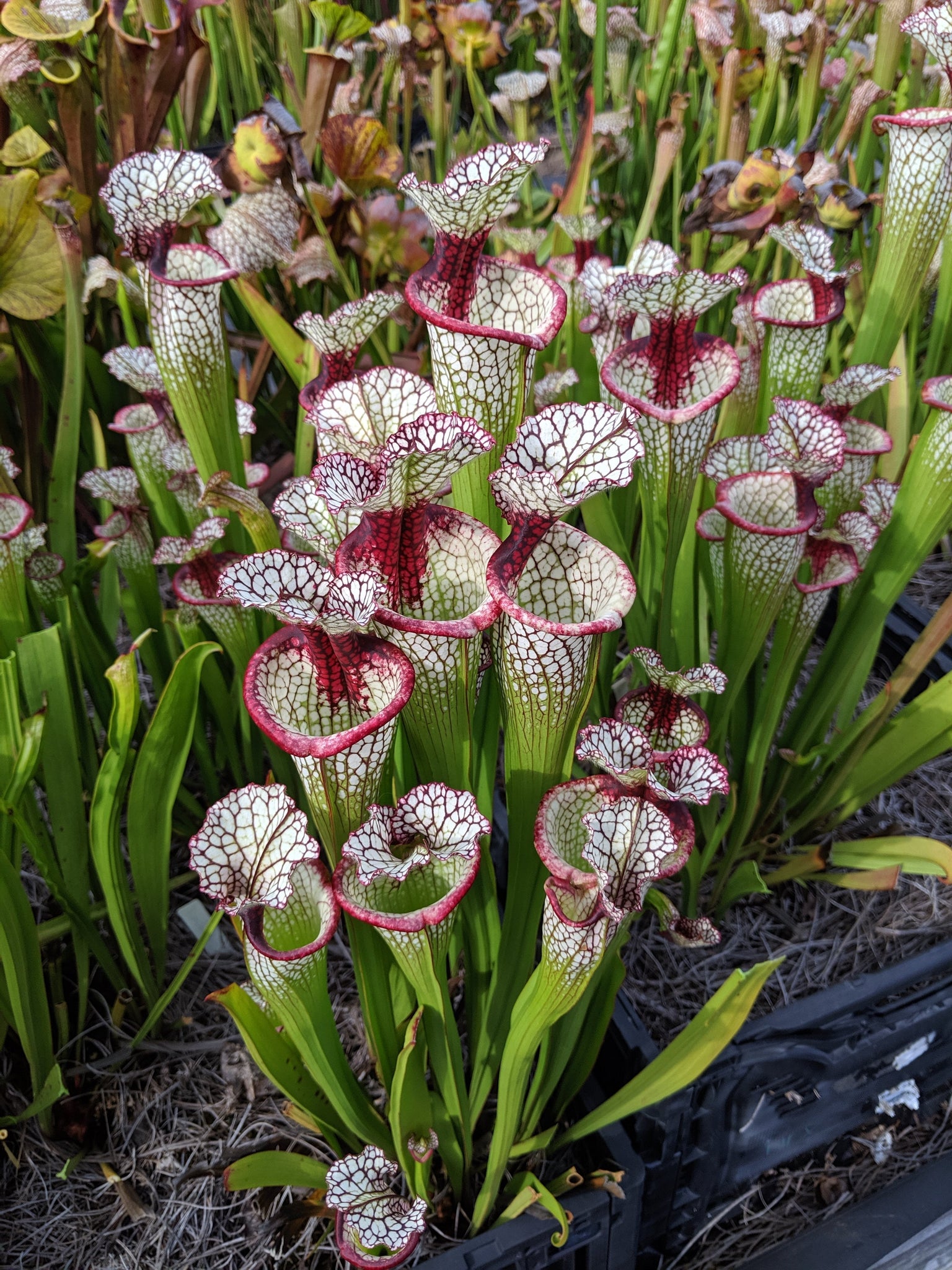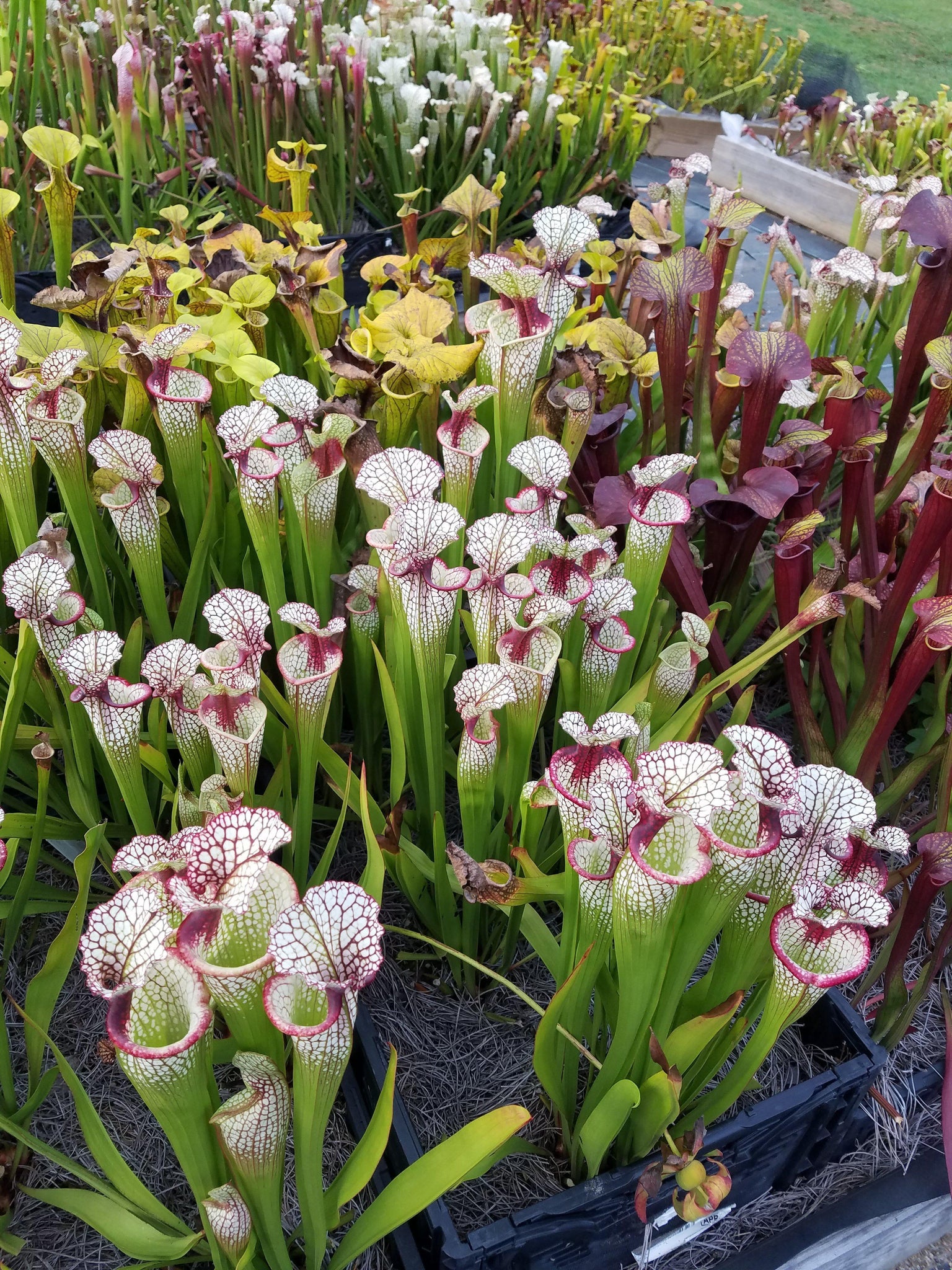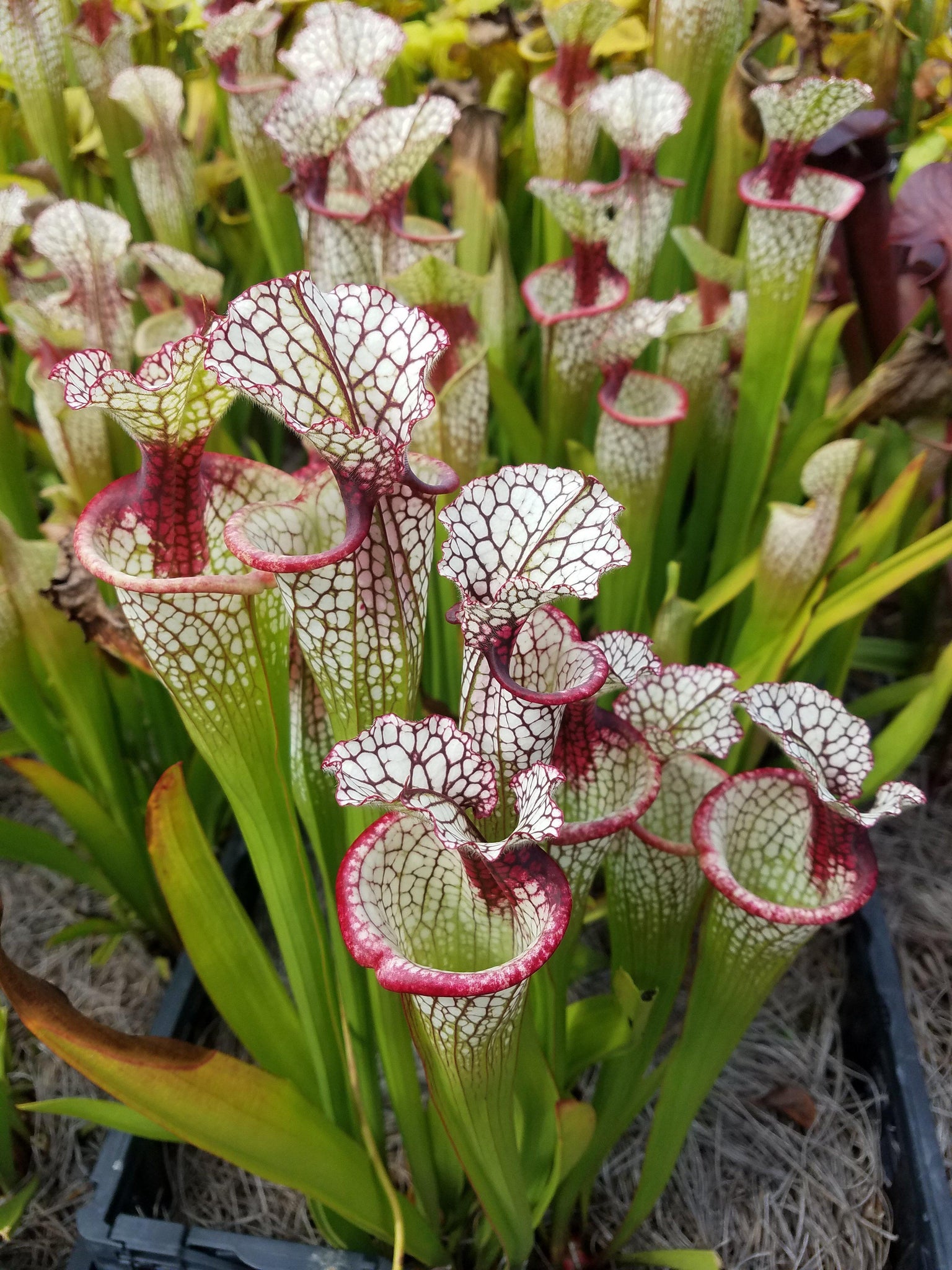 Spring pitchers are approximately 24" tall, 1.5"-2" diameter, bright white with red venation on the top. August pitchers are 20" tall, 2.5" diameter and more rigid. Peristomes mature to red when grown in bright light. Hood columns are narrow, often resulting in the lid touching in the back. Established plants typically produce 2 leaves per growth point in the spring, followed by summer phylodia. In August, plants typically produce two more leaves per growth point.